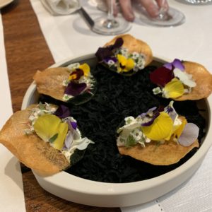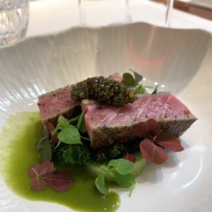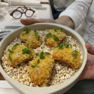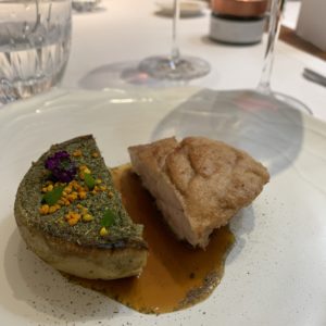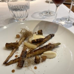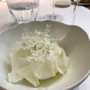 Son plat d’oursin « en clair-obscur » est un modèle du genre : avec son visuel immaculé, on pourrait s’attendre à un plat consensuel. Mais la force gronde sous ce manteau blanc, qui cache un intérieur de couleur sombre et puissant en bouche, avec ce crémeux infusé au whisky Nikka et au Kuromame (un grain de soja noir torréfié) et une eau de pomme Chanteclerc… « Je défends la puissance aromatique car, étant une femme, j’ai souvent eu peur qu’on dise que ma cuisine était mièvre et sans force, assure-t-elle. J’aime la luminosité mais je revendique aussi les goûts sombres, associés au thé, au goût fumé, au poudreux. Il faut savoir osciller entre l’ombre et la lumière. » La personnalité et l’imprégnation se retrouvent aussi dans ses salsifis rôties, déglacées à la bière et au miel de thym, avec un sabayon sobacha/orge ou dans sa ventrêche de thon rôtie au feu de bois, jus de cresson infusé au sapin et feuille de bergamote.