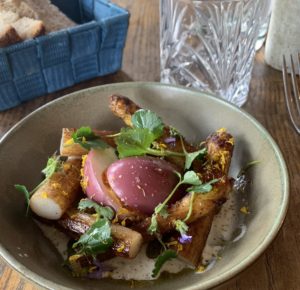 Le menu donne le choix entre deux plats, deux entrées ou deux desserts. Les deux entrées trahissent le goût du chef, d’origine italienne, pour la fermentation et une pointe d’amertume (et l’on s’en réjouit !) : terrine du chef (faite maison) et pickles ; Œuf, pickles, asperges, hollandaise citron sumac coco. Ce dernier est aussi beau dans l’assiette que bon au palais, avec sa petite pointe piquante bien balancée par la robustesse des asperges blanches bien rôties, délicates dans leurs colliers d’herbes et de fleurs.