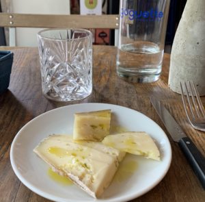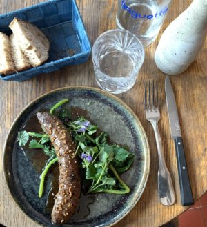 Côté plats, on décline le maigre, broccolini, bok choy pois et petit pois pour mordre dans la saucisse de veau, cime di rapa (un brocoli-rave) et moutarde. C’est bien frais, le légume justement blanchi et assaisonné, la viande solide et juteuse. A ce moment-là, on n’avait plus vraiment faim mais cette ambiance de week-end et sans prise de tête, en pleine semaine, vous incite à vous lâcher : tartelette poire, livêche, mousse sarriette ou tomme à l’ail des ours ? Le fromage fut un bon choix : bien tendre et régressif, relevé d’un filet généreux d’huile d’olive bien verte (de chez Profil Grec, évidemment !)