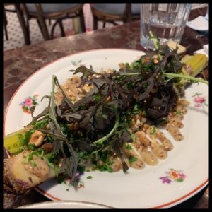Ici non plus, on ne lésine pas sur le (bon) rapport qualité-prix. Les deux concepteurs du lieu, Victor et Charly, ont misé sur un sourcing chez les producteurs, une cuisine faite-maison et pour de gros volumes (300 ouverts/jour) et une décoration à la fois moderne et vintage, mêlant fleurs, tables et sol de bistrots, photos vintage et carafe d’eau en forme d’écureuil. Pour ouvrir l’appétit, on se partage des « trouvailles » contemporaines à grignoter (truite fumée des Pyrénées, saucisson truffé…) ; ensuite, c’est un défilé en règle des plats traditionnels : poireau vinaigrette (snacké, avec une débauche d’herbes et de noisettes torréfiées), œuf mayo (correct pour 2€) ou velouté de céleri ; hampe grillée (Salers AOP) de caractère et surtout un croque-monsieur de fort belle tenue, moelleux et gratiné (avec ou sans œuf et jambon truffé). Le clou du spectacle se cache dans un Saint-Honoré épatant : croustillant dehors, crémeux dedans, fort en noisettes craquantes et en praliné.