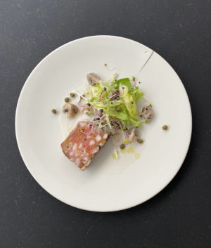 « Champignons de Paris farcis comme il se doit de queues de champignons, volée d’avoine cristallisé au poivre noir »