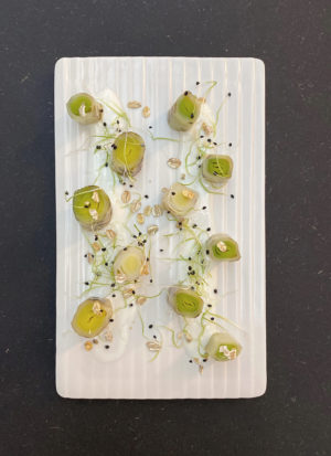La Halle aux grains leur a servi un répertoire sur un plateau : les céréales, les pousses et les semences sont leur nouveau terrain de jeu. Le restaurant n’est pas végan pour autant. Les viandes de l’Aubrac, les poissons de ligne et les végétaux les ont accompagnés dans la capitale, mais un aréopage de graines, de légumineuses, d’oléagineux et d’ombellifères, tous rigoureusement sourcés, viennent jouer les brillants seconds rôles dans l’assiette. « Avec les céréales, nous n’avions jamais poussé la démarche créative jusque-là, raconte le patriarche Michel Bras, 74 ans. C’est la continuité du travail sur le végétal qui m’anime depuis 1978 : ça nous a donné l’occasion d’aller à la source, de nous occuper aussi de la semence, pas seulement de la partie aérienne de la plante. »