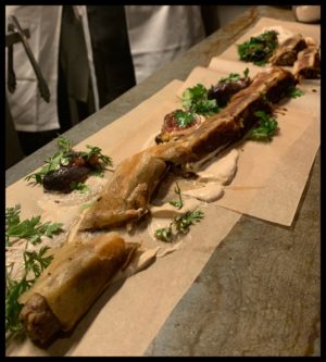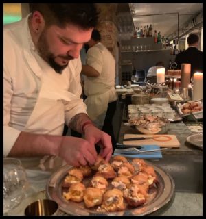 Dans la salle du restaurant, aucune table. Ici, on mange sur le grand passe-plat rectangulaire, qui borde une petite cuisine centrale totalement ouverte, où les chefs accomplissent une chorégraphie qui a tout du ballet festif. Leur étonnante décontraction cache une discipline stricte et une organisation au cordeau : ils cuisinent ou chantent sur la musique mais un signal du chef et tous rentrent dans le rang avec virtuosité. Autour de cette cuisine-estrade, les clients sont à la fois au restaurant et au spectacle, ébahis par tant d’audace vis-à-vis des codes habituels.