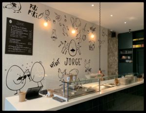 Jorge implante le poulet à la portugaise en plein cœur de Paris et plus précisément les churrascos, les grillades. Mariné dans une sauce typique nommée piri-piri à base de piment oiseau, de paprika, de tomates ou d’oignons (les autres ingrédients sont secrets), le poulet fermier Label rouge est préparé en crapaudine pour une cuisson homogène. Il est placé dans une rôtissoire portugaise : à la verticale, avec des jets d’eau qui viennent humidifier les chairs pendant la cuisson pour préserver sa tendreté. Avant de mordre dans notre plat, on choisit parmi les quatre sauces selon l’envie du moment : le « peps » de l’avocat-citron, l’onctuosité de la forestière, la piri-piri en deux versions (douce ou piquante) et la marinade de poivrons (poulet+ accompagnements, 9,90 euros ; quart de poulet, 6,90 euros). On peut prendre les quatre accompagnements si on a un gros appétit (ratatouille, pommes de terre, patates douces ou riz). Les plus sages préféreront la salade César (8,90 euros). Les plus mordus emporteront chez eux le poulet braisé entier (22,90 euros).