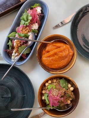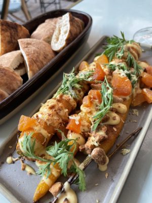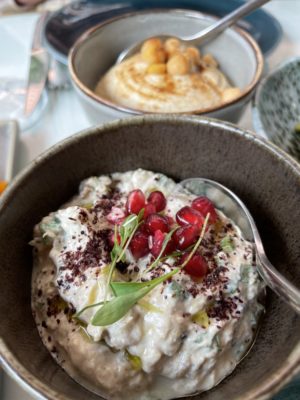 Manzili cède à la mode des assiettes à partager mais avec élégance : on plonge dans un mezze réussi, avec un caviar d’aubergines au bon goût fumé, relevé de grenades ; le houmous à la tahina et zaatar est au diapason mais c’est le chou-fleur rôti qui nous emporte : parfaitement cuit, presque frit, adoucit par un tzatziki crémeux et des pistaches torréfiées. Les carottes rôties au cumin, elles, s’offrent une mayonnaise à l’orange.