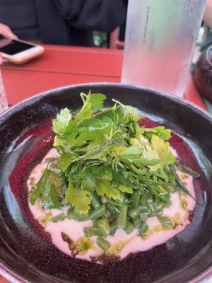 La finaliste de Top Chef a posé ses couteaux dans la cour végétalisée de l’Hôtel du Grand Quartier, dans le 10e. Ici, point de Grand Vacarme : à l’écart de la rue, la cheffe de 26 ans déploie dans le calme une cuisine « sauvage » et herbacée. Ici, elle donne une tournure plus végétale et estivale aux classiques de son restaurant de Nantes, qui penchent plutôt vers la cuisine de bistrot et la street-food.