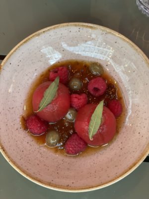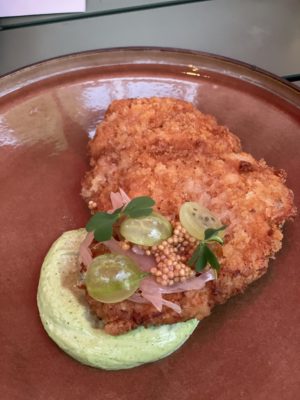 Côté « grandes » assiettes, on trouve une plus classique sole entière au beurre blanc, amandes grillées et sureau et un joli schnitzel bien accompagné d’une sauce groseille à maquereau et graines de moutarde, oignon fumé et mayo à l’estragon. Côté dessert, on reste un peu sur notre faim, même avec les très (trop ?) attendus bonbons de tomate cerise à la verveine, remarquée dans le concours d’M6, ou l’audacieuse gaufre sarrasin/os à moelle et sucre de pollen. Qu’importe, ce grand vacarme est au diapason d’un bel été parisien.